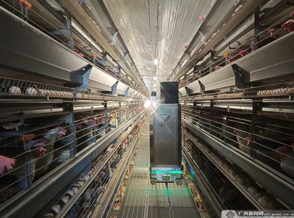 机器人养鸡,让每只鸡的进食、活动、休眠更加科学合理;一台机器人,能精准管理16万只鸡,省掉24名工人……在玉林市福绵区成均镇的农贝贝生态养殖基地,一排排智能化鸡舍静立于青山绿水间,这里没有传统养殖场的喧嚣,只有机械运转的轻微嗡鸣。