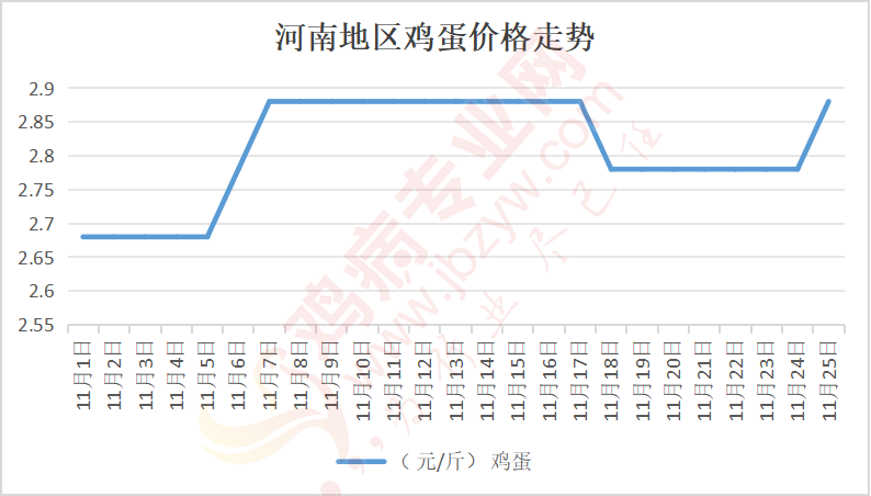 鸡病专业网消息:11月25日,河南郑州鸡蛋2.9元/斤,涨;新密鸡蛋2.9元/斤,涨;荥阳鸡蛋2.9元/斤,涨;中牟鸡蛋2.9元/斤,涨;周口鸡蛋2.85元/斤,涨;商丘鸡蛋87元/30斤,涨;鹤壁鸡蛋2.85元/斤,涨;汝州鸡蛋2.85元/斤,涨;开封鸡蛋86-87元/30斤,涨;漯河鸡蛋2.85元/斤,涨;漯河临颍鸡蛋2.85元/斤,涨;许昌鸡蛋2.9元/斤,涨;南阳鸡蛋2.85元/斤,涨;南阳邓州鸡蛋2.85元/斤,涨;新乡鸡蛋2.85元/斤,涨;安阳鸡蛋2.85元/斤,涨;新郑鸡蛋2.9元/斤,涨;登封鸡蛋2.9元/斤,涨;平顶山鸡蛋2.9元/斤,涨;驻马店鸡蛋2.9元/斤,涨;三门峡鸡蛋2.9元/斤,涨;焦作鸡蛋2.85元/斤,涨;信阳鸡蛋2.85元/斤,涨;濮阳鸡蛋2.85元/斤,涨。