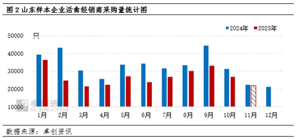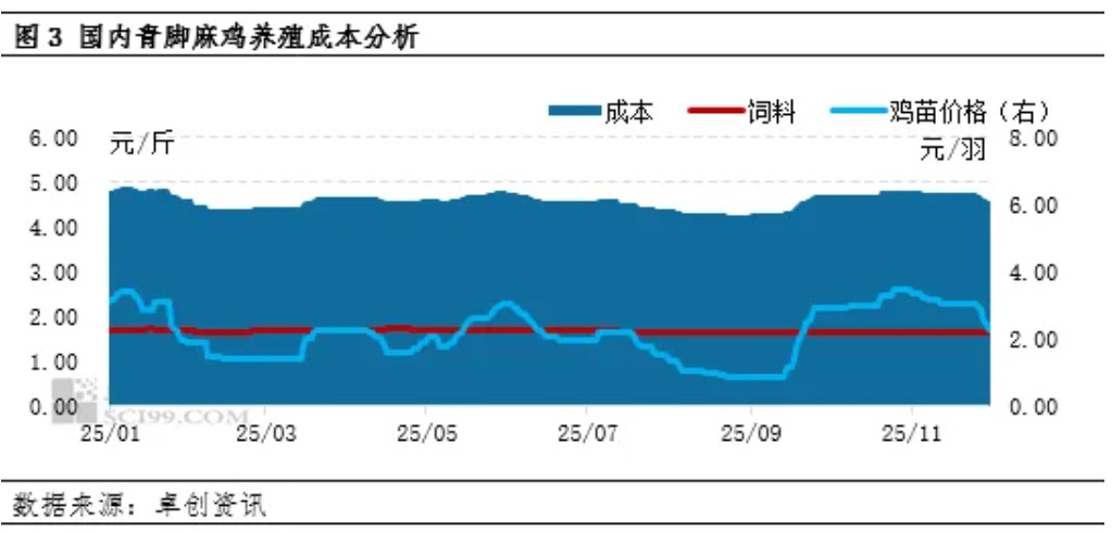 2025年四季度麻鸡养殖盈利逐渐收缩的态势预计在12月得以延续。首先从成本面来看,受前期饲料价格变化影响,12月出栏毛鸡对应的饲料成本有所下降;鸡苗方面受前期养殖盈利持续下滑影响,养殖端补栏心态谨慎,导致10月鸡苗价格存较大跌幅,进而导致12月出栏毛鸡对应的鸡苗成本下降,根据卓创资讯监测数据显示,12月出栏毛鸡对应的鸡苗成本由3.06元/羽减少至1.94元/羽,降幅达36.60%,综合养殖成本由4.74元/斤减少至4.51元/斤,降幅4.85%。毛鸡养殖成本下降,对12月毛鸡养殖盈利有利多支撑。(备注:饲料及鸡苗价格均为一个养殖周期前的价格)