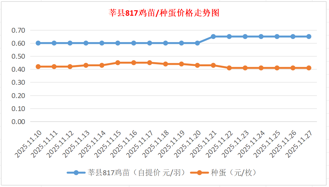 817鸡苗(混合):报价自提0.65元/羽。(稳)