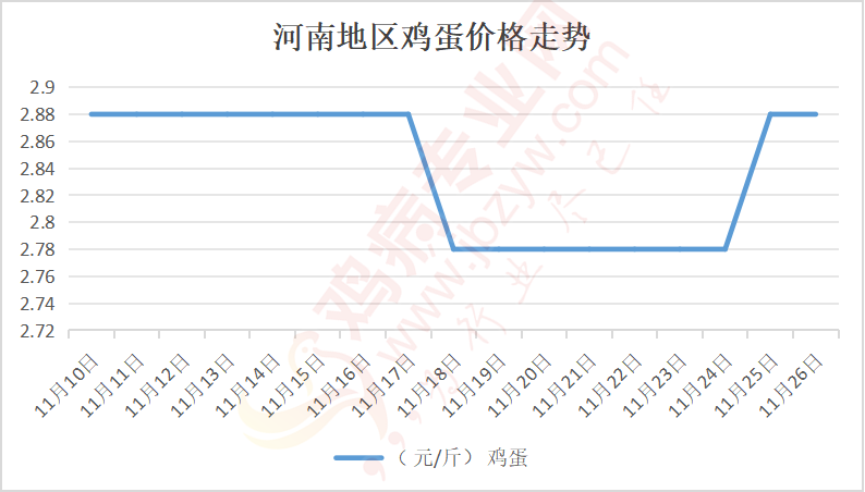 鸡病专业网消息:11月26日,河南郑州鸡蛋2.9元/斤,稳;新密鸡蛋2.9元/斤,稳;荥阳鸡蛋2.9元/斤,稳;中牟鸡蛋2.9元/斤,稳;周口鸡蛋2.85元/斤,稳;商丘鸡蛋87元/30斤,稳;鹤壁鸡蛋2.85元/斤,稳;汝州鸡蛋2.85元/斤,稳;开封鸡蛋86-87元/30斤,稳;漯河鸡蛋2.85元/斤,稳;漯河临颍鸡蛋2.85元/斤,稳;许昌鸡蛋2.9元/斤,稳;南阳鸡蛋2.85元/斤,稳;南阳邓州鸡蛋2.85元/斤,稳;新乡鸡蛋2.85元/斤,稳;安阳鸡蛋2.85元/斤,稳;新郑鸡蛋2.9元/斤,稳;登封鸡蛋2.9元/斤,稳;平顶山鸡蛋2.9元/斤,稳;驻马店鸡蛋2.9元/斤,稳;三门峡鸡蛋2.9元/斤,稳;焦作鸡蛋2.85元/斤,稳;信阳鸡蛋2.85元/斤,稳;濮阳鸡蛋2.85元/斤,稳。