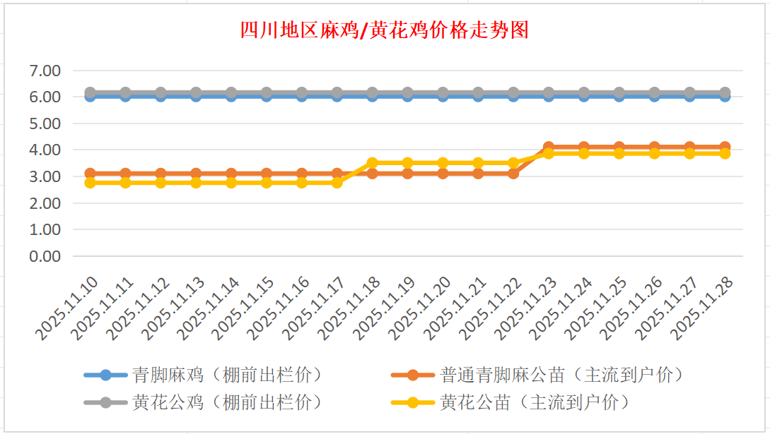 普通青脚麻公苗:价格稳定,主流到户价4.00-4.20元/羽,稳。