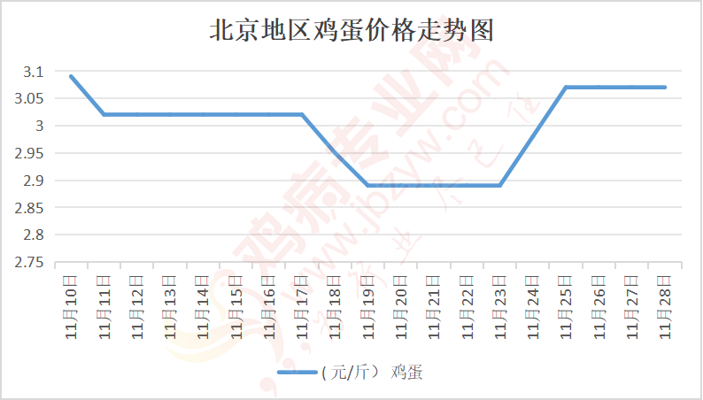 鸡病专业网消息:11月28日,北京大洋路鸡蛋主流批发价格135-136元/44斤,稳,到货5台车,成交灵活,走货一般;回龙观鸡蛋135元/44斤,稳;顺义石门鸡蛋135元/44斤,稳。