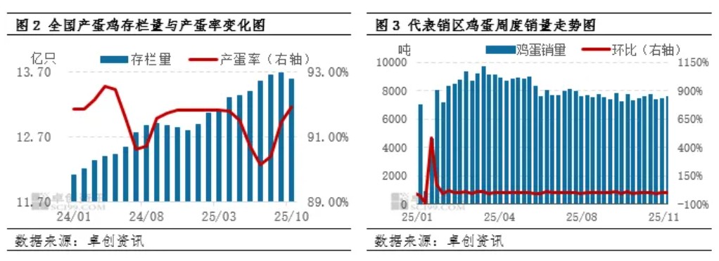 根据前期鸡苗销量估算,12月份进入产蛋期的蛋鸡应为8月补栏的鸡苗,此阶段鸡苗销量环比减少0.43%,而12月出栏的老母鸡是2024年7-8月份补栏的鸡苗,此时间段鸡苗销量环比增多,因此,12月份待出栏老母鸡环比增加,出栏老鸡多于新开产蛋鸡的现象仍将继续,产蛋鸡存栏量或延续减少趋势,鸡蛋产量或减少,供应压力缓解。需求方面,12月份多数时间仍处消费淡季,少数时间或有商超、电商平台的促销活动,且2026年春节时间靠后,春节需求对12月鸡蛋消费的拉动作用不明显,因此预计12月份鸡蛋需求或长期暂处低位,月底或微幅增多。综上所述,12月份全国鸡蛋供应量或高位减少,供应压力略有缓解,需求或长期维持低位,月底短暂增加,鸡蛋价格或在中上旬维持低位,月底有小幅上涨可能,月内价格或在2.80-3.10元/斤的范围内调整。