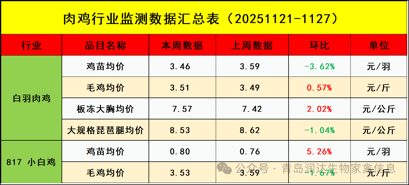817小白鸡:短期市场毛鸡供应总量不大,但近期市场走货一般,企业采购积极性难有明显提升,预计下周毛鸡交投先稳后弱,均价环比微涨。12月上旬市场鸡源稍增,交投或稍显弱势,进入中旬企业采购积极性有所提升,需求带动下毛鸡价格或趋强运行。(密切关注替代品价格以及气温变化)