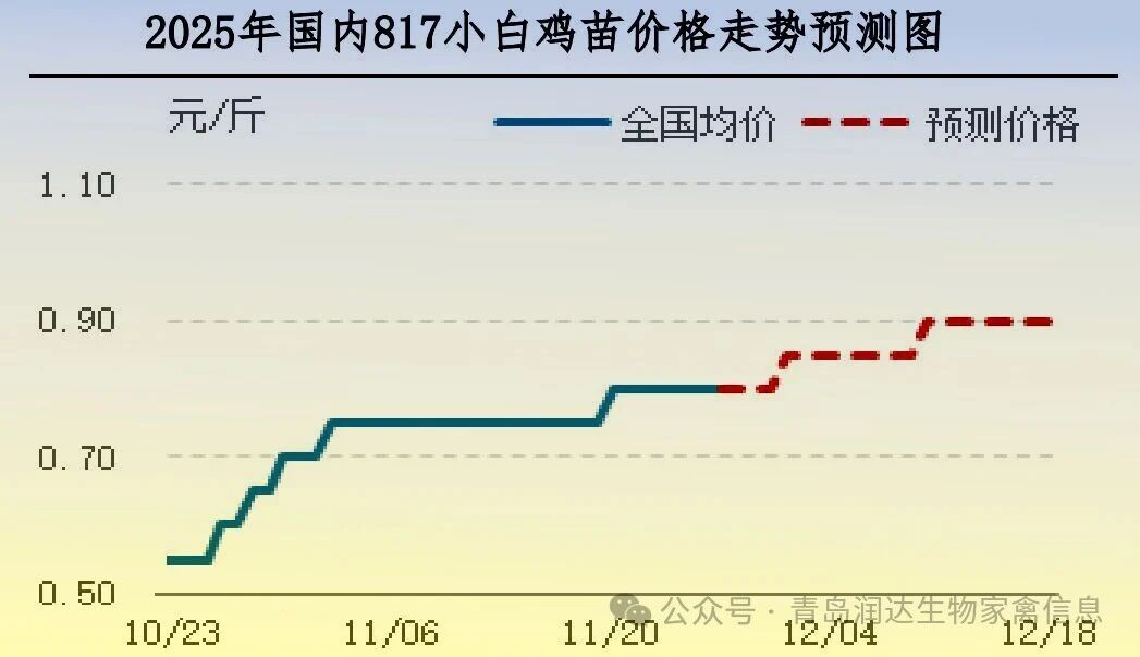 817小白鸡鸡苗:近期养殖端补栏心态平稳,市场鸡苗供应总量不大,供应面支撑下苗价短期或走强,预计下周鸡苗市场先稳后涨,均价环比上涨。12月中上旬市场鸡苗供应量存增多预期,养殖端补栏积极性尚可,届时鸡苗价格或上涨。预计未来三周817小白鸡苗价格呈稳中上行走势。