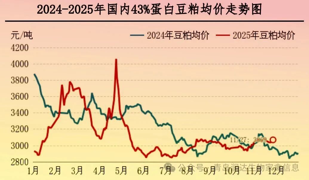 本周全国43%蛋白豆粕周度均价3048元/吨,与上周均价相比,下跌15元/吨,跌幅0.49%。