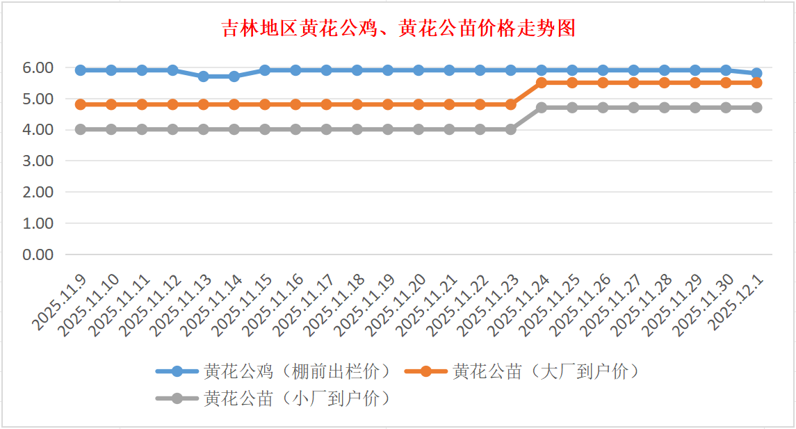 黄花公苗:价格稳定,大厂到户价5.50元/羽,小厂到户价4.70元/羽,稳。