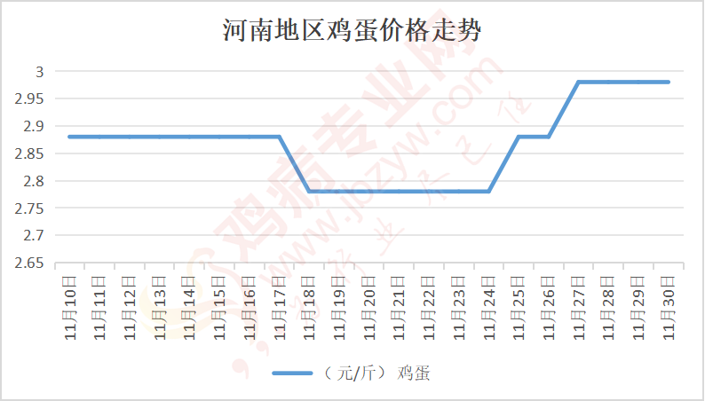 鸡病专业网消息:11月30日,河南郑州鸡蛋3元/斤,稳;新密鸡蛋3元/斤,稳;荥阳鸡蛋3元/斤,稳;中牟鸡蛋3元/斤,稳;周口鸡蛋2.95元/斤,稳;商丘鸡蛋90元/30斤,稳;鹤壁鸡蛋2.95元/斤,稳;汝州鸡蛋2.95元/斤,稳;开封鸡蛋90元/30斤,稳;漯河鸡蛋2.95元/斤,稳;漯河临颍鸡蛋2.95元/斤,稳;许昌鸡蛋3元/斤,稳;南阳鸡蛋2.95元/斤,稳;南阳邓州鸡蛋2.95元/斤,稳;新乡鸡蛋2.95元/斤,稳;安阳鸡蛋2.95元/斤,稳;新郑鸡蛋3元/斤,稳;登封鸡蛋3元/斤,稳;平顶山鸡蛋3元/斤,稳;驻马店鸡蛋3元/斤,稳;三门峡鸡蛋3元/斤,稳;焦作鸡蛋2.95元/斤,稳;信阳鸡蛋2.95元/斤,稳;濮阳鸡蛋2.95元/斤,稳。