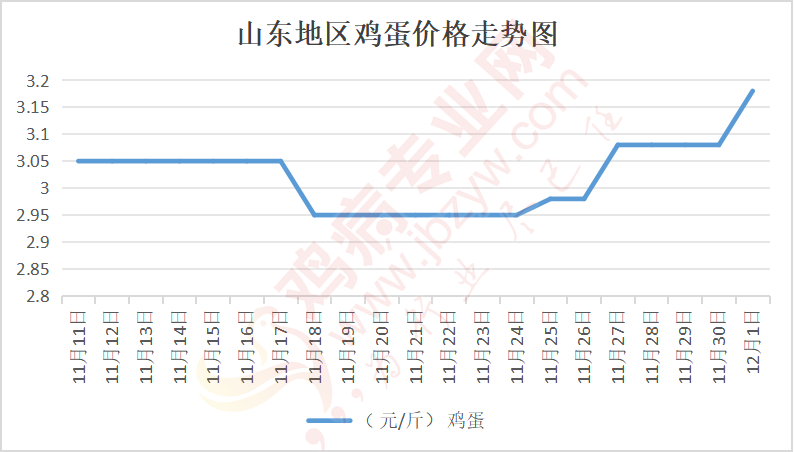 鸡病专业网消息:12月1日,山东地区莱阳鸡蛋3.2元/斤,涨;青岛鸡蛋3.2元/斤,涨;诸城鸡蛋3.2元/斤,涨;安丘鸡蛋3.15元/斤,涨;昌乐鸡蛋3.15元/斤,涨;寿光鸡蛋3.15元/斤,涨;昌邑鸡蛋3.15元/斤,涨;高密鸡蛋3.2元/斤,涨;青州鸡蛋3.15元/斤,涨;临朐鸡蛋3.15元/斤,涨;莱州鸡蛋3.2元/斤,涨;威海鸡蛋3.2元/斤,涨;临沭鸡蛋3.15元/斤,涨;沂水鸡蛋3.15元/斤,涨;沂南鸡蛋3.15元/斤,涨;莒南鸡蛋3.15元/斤,涨;兰陵县鸡蛋3.15元/斤,涨;日照鸡蛋3.15元/斤,涨;莒县鸡蛋3.15元/斤,涨;日照辛萁商贸鸡蛋3.15元/斤,涨;泗水鸡蛋价格93元/斤,涨;济宁、汶上鸡蛋价格93元/斤,涨;梁山、东平红蛋价格93元/斤,涨;枣庄滕州地区鸡蛋混码主流到户94元/30斤,涨;泰安地区新泰鸡蛋价格93元/斤,涨;菏泽地区曹县主流到户93元/斤,涨;成武鸡蛋价格93元/斤,涨;单县到户93元/斤,涨;聊城莘县93元/斤,涨。