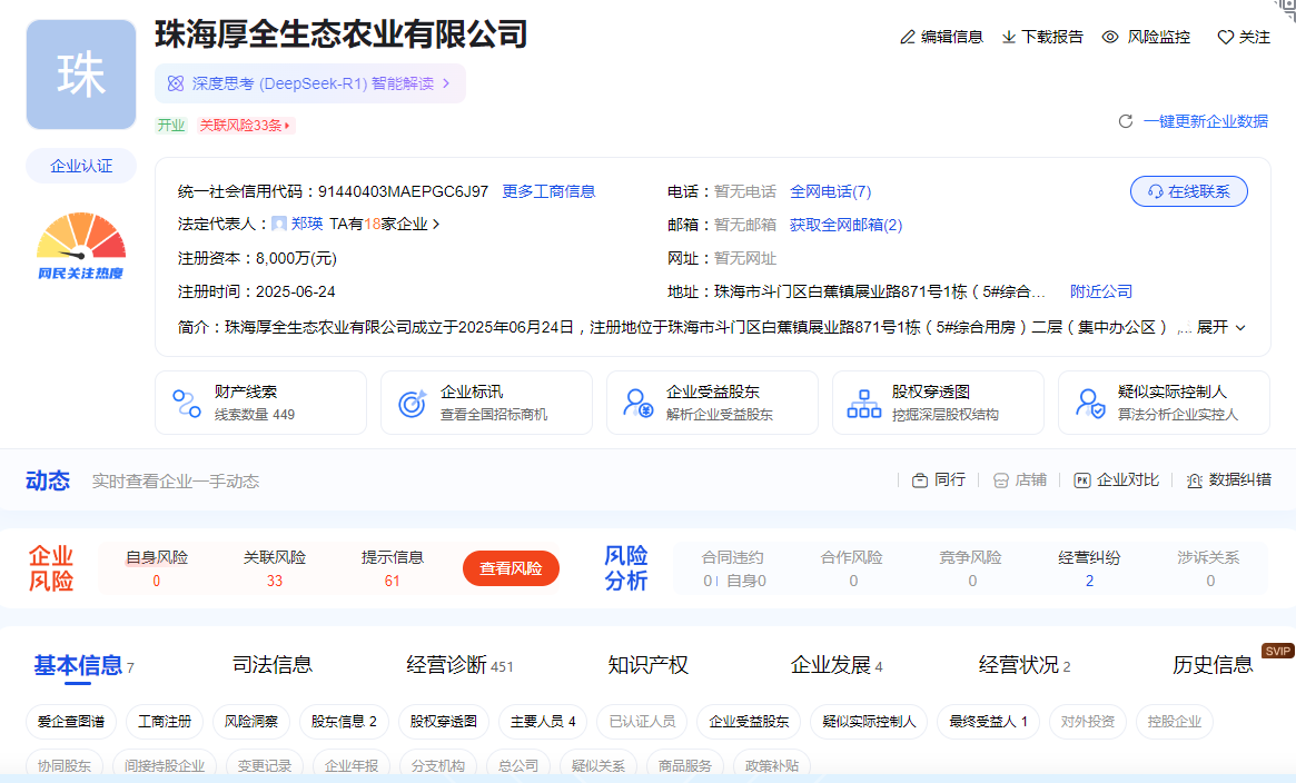 作为厚全食品旗下核心项目,珠海厚全生态农业有限公司成立于2025年6月,由四川厚全生态食品有限公司持股90%、珠海市农业集团有限公司持股10%共同组建,注册资本达8000万元,凭借股东方在养殖领域的成熟经验与地方国企的资源优势,从诞生之初便确立了高端化、生态化的发展定位。