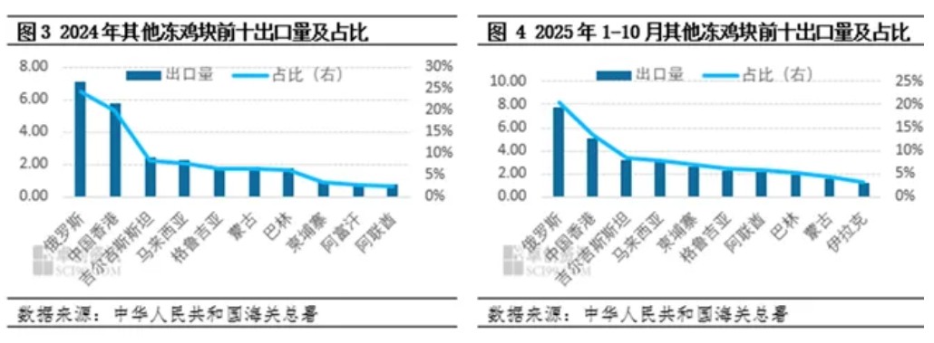 结合图3及图4出口数据来看,我国鸡胸肉出口市场正经历显著的结构重塑与增长逻辑升级:传统核心市场虽仍保持基本盘,但占比与动能逐步向新兴区域倾斜。具体来看,俄罗斯、中国香港作为长期稳居前二的出口目的地,其中俄罗斯从2024年的7.07万吨胸肉进口量增至2025年1-10月的7.79万吨,中国香港则从前期5.81万吨下调5.08万吨,二者的国内鸡胸肉出口的市场占比均出现明显回落(分别从24.22%、19.90%降至20.46%、13.56%),反映出传统市场需求增长进入平稳期。与此同时,新兴市场的崛起成为结构调整的核心亮点:吉尔吉斯斯坦不仅出口量从2.41万吨跃升至3.23万吨,占比也自8.26%提升至8.50%,位列出口前三;柬埔寨、阿联酋等东南亚及中东市场同步实现出口量及占比双升,伊拉克更成为新进入的主力市场,出口量达1.21万吨、占比3.18%,位列胸肉出口国家榜单的第十。除此之外,卡塔尔、土库曼斯塔、乌兹别克斯坦、莫桑比克、哈萨克斯坦对其胸肉出口量虽不在前十梯队,但却是2025年6月下起新增或出口显著增量的国家,这一变化清晰体现出我国鸡胸肉出口正从“集中依赖少数核心市场”转向“传统市场稳基盘、新兴市场拓增量”的多元格局,东南亚、中东、中亚等区域的需求爆发,既完善了出口地理版图,也为后续出口增长注入了更可持续的动能。