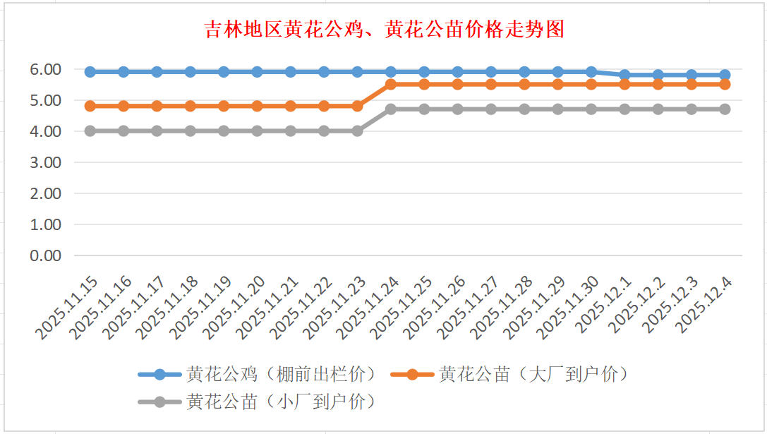 黄花公苗:价格稳定,大厂到户价5.50元/羽,小厂到户价4.70元/羽,稳。