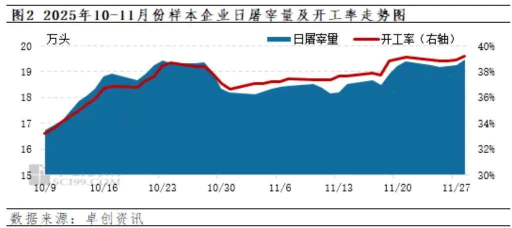 在需求方面,12月份,消费需求延续稳固回升的局面!一方面,家庭消费热度逐步提升,冷空气活动或日益频繁,北方地区气温进一步下降,0℃线或进一步南压,居民家庭采购需求或将逐步改善;另一方面,南方地区,腌腊刚需转强,猪肉需求意愿提升,市场白条走货节奏加快,主流屠宰场订单量增多,开工率逐步上移,截至目前,样本屠企开工率在37.02%!
