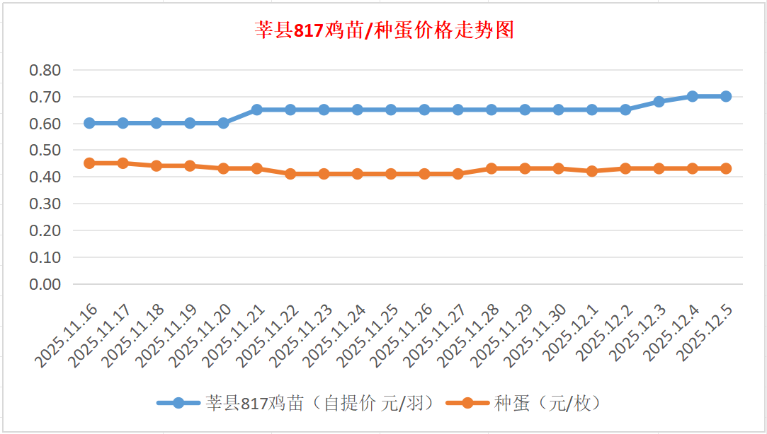817鸡苗(混合):报价自提0.70元/羽。(稳)