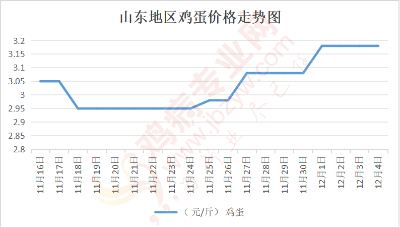 鸡病专业网消息:12月4日,山东地区莱阳鸡蛋3.2元/斤,稳;青岛鸡蛋3.2元/斤,稳;诸城鸡蛋3.2元/斤,稳;安丘鸡蛋3.15元/斤,稳;昌乐鸡蛋3.15元/斤,稳;寿光鸡蛋3.15元/斤,稳;昌邑鸡蛋3.15元/斤,稳;高密鸡蛋3.2元/斤,稳;青州鸡蛋3.15元/斤,稳;临朐鸡蛋3.15元/斤,稳;莱州鸡蛋3.2元/斤,稳;威海鸡蛋3.2元/斤,稳;临沭鸡蛋3.15元/斤,稳;沂水鸡蛋3.15元/斤,稳;沂南鸡蛋3.15元/斤,稳;莒南鸡蛋3.15元/斤,稳;兰陵县鸡蛋3.15元/斤,稳;日照鸡蛋3.15元/斤,稳;莒县鸡蛋3.15元/斤,稳;日照辛萁商贸鸡蛋3.15元/斤,稳;泗水鸡蛋价格93元/斤,稳;济宁、汶上鸡蛋价格93元/斤,稳;梁山、东平红蛋价格93元/斤,稳;枣庄滕州地区鸡蛋混码主流到户94元/30斤,稳;泰安地区新泰鸡蛋价格93元/斤,稳;菏泽地区曹县主流到户93元/斤,稳;成武鸡蛋价格93元/斤,稳;单县到户93元/斤,稳;聊城莘县93元/斤,稳。