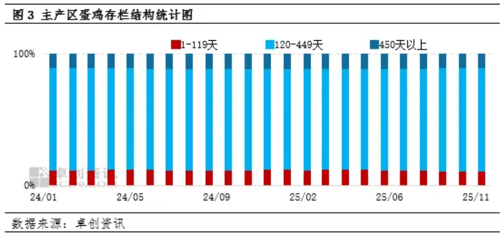 养殖端延续微利与亏损交替波动的状态,养殖户出栏老母鸡积极性较高,因此老母鸡出栏量延续相对高位,导致450日龄以上蛋鸡存栏占比延续相对低位,进而促进大码鸡蛋货源相对有限;当前鸡蛋价格仍处于历年同期相对低位,部分养殖户担心后市行情,且受蛋鸡疫病频发影响,整体补栏积极性较低,部分市场存在空栏情况,120日龄以下后备蛋鸡占比环比减少接近0.2个百分点,蛋鸡存栏结构延续“中间大、两头小”的橄榄型结构。此外气温进一步下降后,蛋鸡采食量逐步提升,共同导致鸡蛋重量偏高,因此中小码鸡蛋供应相对有限。但节日效应减弱后,下游食品加工厂开工率不高,各大平台对中小鸡蛋促销引流活动的热情亦逐步下降,故市场对中小码鸡蛋货源需求较为平淡。中小码鸡蛋供求双淡的趋势较为明显,未来冷库压力仍存。