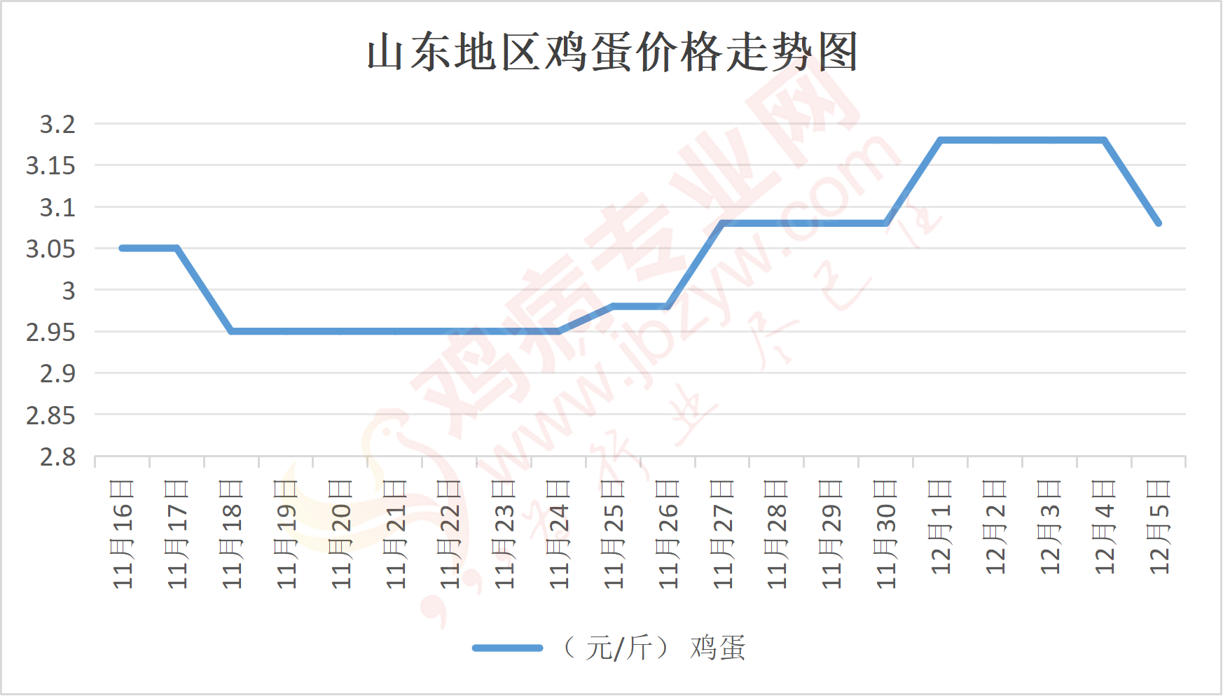 鸡病专业网消息:12月5日,山东地区莱阳鸡蛋3.1元/斤,落;青岛鸡蛋3.1元/斤,落;诸城鸡蛋3.1元/斤,落;安丘鸡蛋3.05元/斤,落;昌乐鸡蛋3.05元/斤,落;寿光鸡蛋3.05元/斤,落;昌邑鸡蛋3.05元/斤,落;高密鸡蛋3.1元/斤,落;青州鸡蛋3.05元/斤,落;临朐鸡蛋3.05元/斤,落;莱州鸡蛋3.1元/斤,落;威海鸡蛋3.1元/斤,落;临沭鸡蛋3.05元/斤,落;沂水鸡蛋3.05元/斤,落;沂南鸡蛋3.05元/斤,落;莒南鸡蛋3.05元/斤,落;兰陵县鸡蛋3.05元/斤,落;日照鸡蛋3.05元/斤,落;莒县鸡蛋3.05元/斤,落;日照辛萁商贸鸡蛋3.05元/斤,落;泗水鸡蛋价格90元/斤,落;济宁、汶上鸡蛋价格90元/斤,落;梁山、东平红蛋价格90元/斤,落;枣庄滕州地区鸡蛋混码主流到户91元/30斤,落;泰安地区新泰鸡蛋价格90元/斤,落;菏泽地区曹县主流到户90元/斤,落;成武鸡蛋价格90元/斤,落;单县到户90元/斤,落;聊城莘县90元/斤,落。