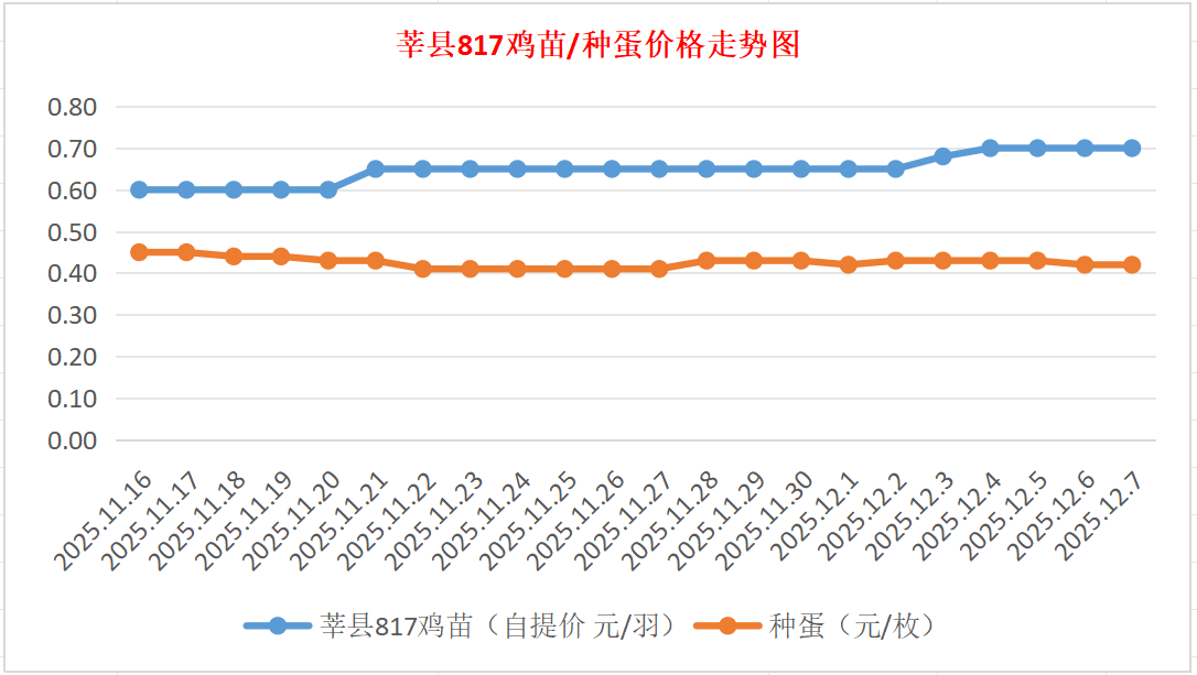 817鸡苗(混合):报价自提0.70元/羽。(稳)