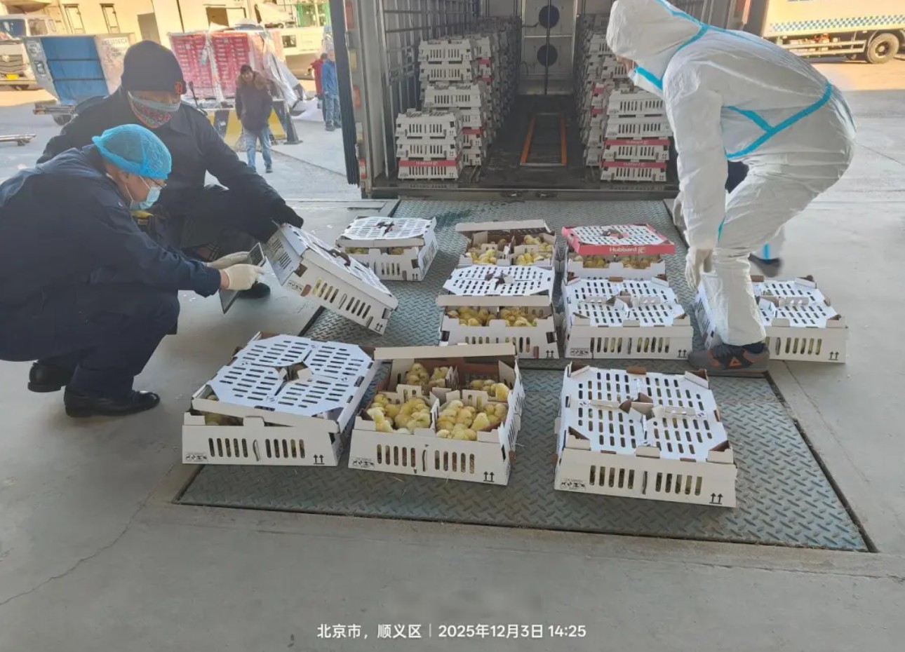 2025年12月3日至4日,益生栖霞祖代场传来佳讯:公司再次成功从法国引进本月首批、本年度第十六批利丰祖代白羽肉种鸡1.8万套。该批种鸡已在北京首都国际机场顺利完成通关,并入驻栖霞隔离场进行严格检疫。