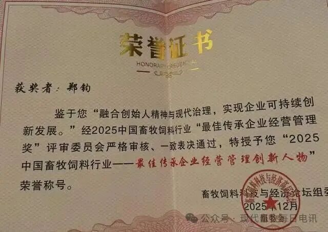 在畜牧饲料科技与经济高层论坛上,总裁郑钧结合近期十五五热点话题分享了企业长久发展和治理架构的相关实践经验。
