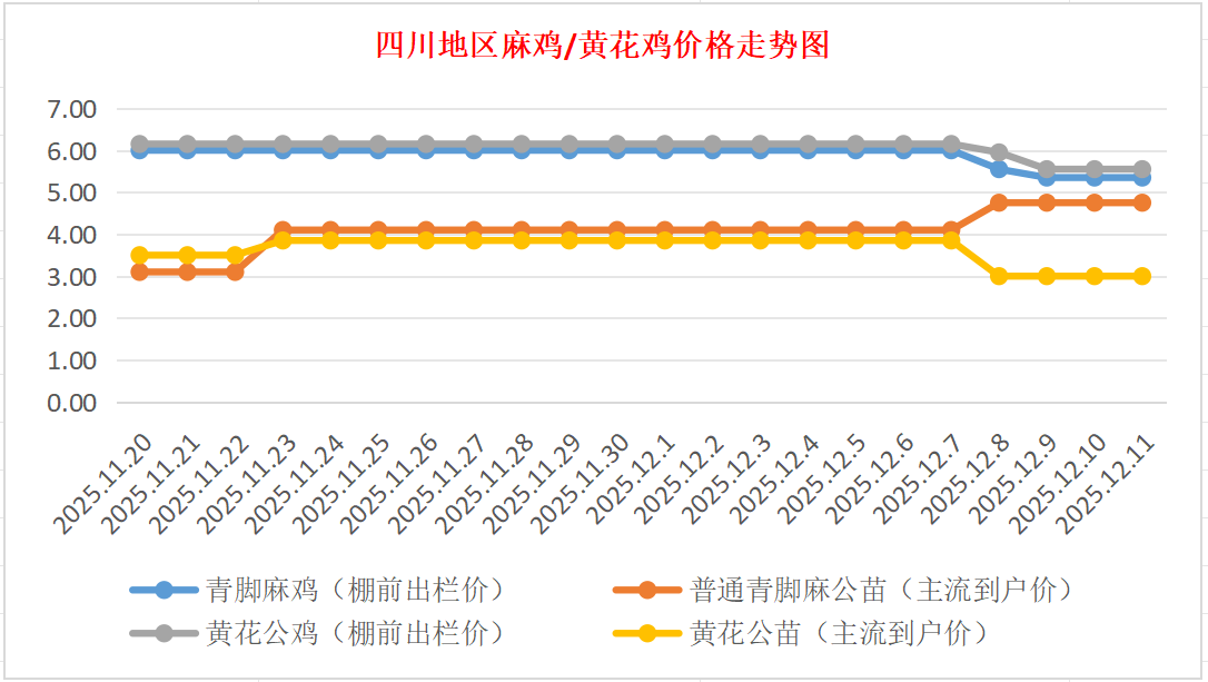普通青脚麻公苗:价格稳定,主流到户价4.50-5.00元/羽,稳。