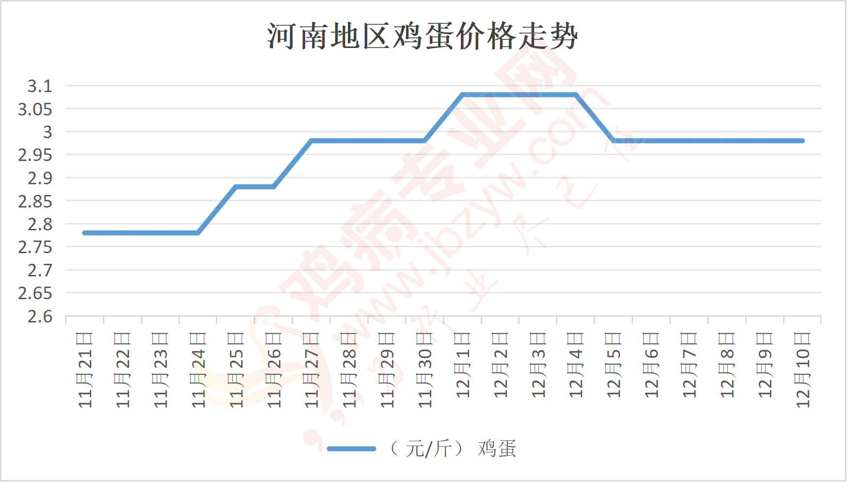 鸡病专业网消息:12月10日,河南郑州鸡蛋3元/斤,稳;新密鸡蛋3元/斤,稳;荥阳鸡蛋3元/斤,稳;中牟鸡蛋3元/斤,稳;周口鸡蛋2.95元/斤,稳;商丘鸡蛋90元/30斤,稳;鹤壁鸡蛋2.95元/斤,稳;汝州鸡蛋2.95元/斤,稳;开封鸡蛋90元/30斤,稳;漯河鸡蛋2.95元/斤,稳;漯河临颍鸡蛋2.95元/斤,稳;许昌鸡蛋3元/斤,稳;南阳鸡蛋2.95元/斤,稳;南阳邓州鸡蛋2.95元/斤,稳;新乡鸡蛋2.95元/斤,稳;安阳鸡蛋2.95元/斤,稳;新郑鸡蛋3元/斤,稳;登封鸡蛋3元/斤,稳;平顶山鸡蛋3元/斤,稳;驻马店鸡蛋3元/斤,稳;三门峡鸡蛋3元/斤,稳;焦作鸡蛋2.95元/斤,稳;信阳鸡蛋2.95元/斤,稳;濮阳鸡蛋2.95元/斤,稳。