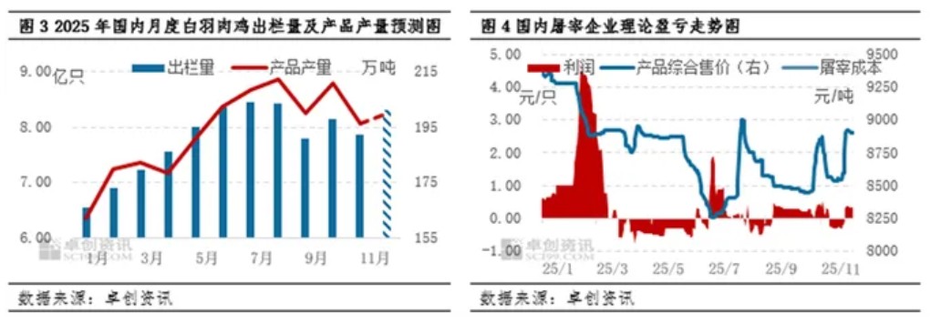 从供应面来看,据卓创资讯数据统计,10月下旬至11月中旬孵化场出苗量呈陆续增加趋势,理论上12月毛鸡出栏量环比增幅7.59%,考虑到温度降低、疫病多发,因此12月毛鸡养殖成活率仍较低,卓创资讯预计12月毛鸡出栏量为8.31亿只,环比增幅5.86%。受毛鸡养殖难度较大影响,出栏均重或降低,因此12月产品产量或为200.06万吨,环比增幅2.00%。从供应面来看,对12月毛鸡及产品市场产生利空影响。从需求面来看,12月由于原料市场需求尚可,对原料类产品价格有较强的支撑作用,市场类产品需求或表现平淡,库存压力提升,其价格或微降,预计12月月内产品综合售价或呈缓降趋势,但月均价或环比上涨,为8.85元/公斤,环比涨幅2.91%。