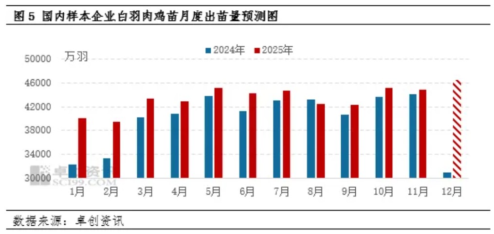 12月年最后一批毛鸡集中补栏结束后鸡苗价格或下跌,月均价降至3.30元/羽,环比跌幅7.82%。12月中旬为年前最后一批毛鸡集中补栏时期,下旬苗市需求或转淡,市场退计划现象或增加。从供应面来看,11月虽种禽端有集中淘汰大周龄种鸡操作,月末在产父母代种鸡存栏量环比微降,但孵化企业多消耗种蛋库存、加大上孵量,预计12月孵化场出苗量或延续增加趋势,样本企业月度出栏量或环比增幅3.73%。供需双重利空市场,12月鸡苗价格或承压下跌。