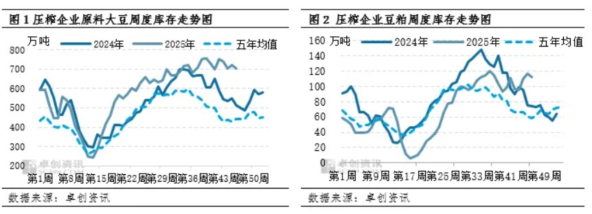 根据中华人民共和国海关总署数据统计显示,11月中国进口大豆810.7万吨,环比下降14.51%。1-11月累计进口量9709.1万吨,同比增加6.9%。原料供应方面持续表现宽松,支撑国内生产企业原料大豆库存高位难去库,截至12月5日当周,根据卓创资讯监测重点生产企业库存数据来看,原料大豆库存为704.9万吨,去年同期数值为513.6万吨,五年均值为443.68万吨。豆粕库存为112.5万吨,去年同期数值为74.3万吨,五年均值为59万吨。企业去库节点持续后移,导致现货端价格重心处于低位水平运行。