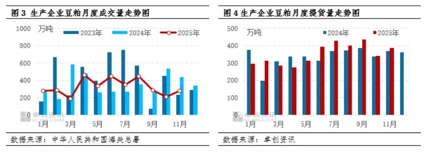 受现货供应充足以及远期原料不确定性较大影响,下游采购心态表现理性,现货多滚动采买,饲料企业库存主动增库意愿较差。从工厂成交数据来看,11月成交总量为276.3万吨,同比下滑36.92%。工厂催提力度下,提货数据环比改善。受远期原料供应不确定性影响,下游对2026年一季度基差成交意向走强,华东市场2026年1-3月以及2026年2-3月基差成交小幅放量,成交价格参考M601+0/10元/吨、M2605+240元/吨。成交主体为下游饲料厂,考虑到折算一口价价格不高,饲料企业安全边际相对较高,适量布局远期基差头寸。需求端来看,对现货价格整体呈现中性影响。