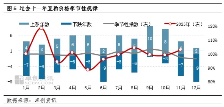 通过过去十一年豆粕价格季节性波动特点来看,2025年下半年价格走势多次打破季节性规律,主要原因在于国内供应节奏的变化以及市场预期不断被纠正的共同影响。
