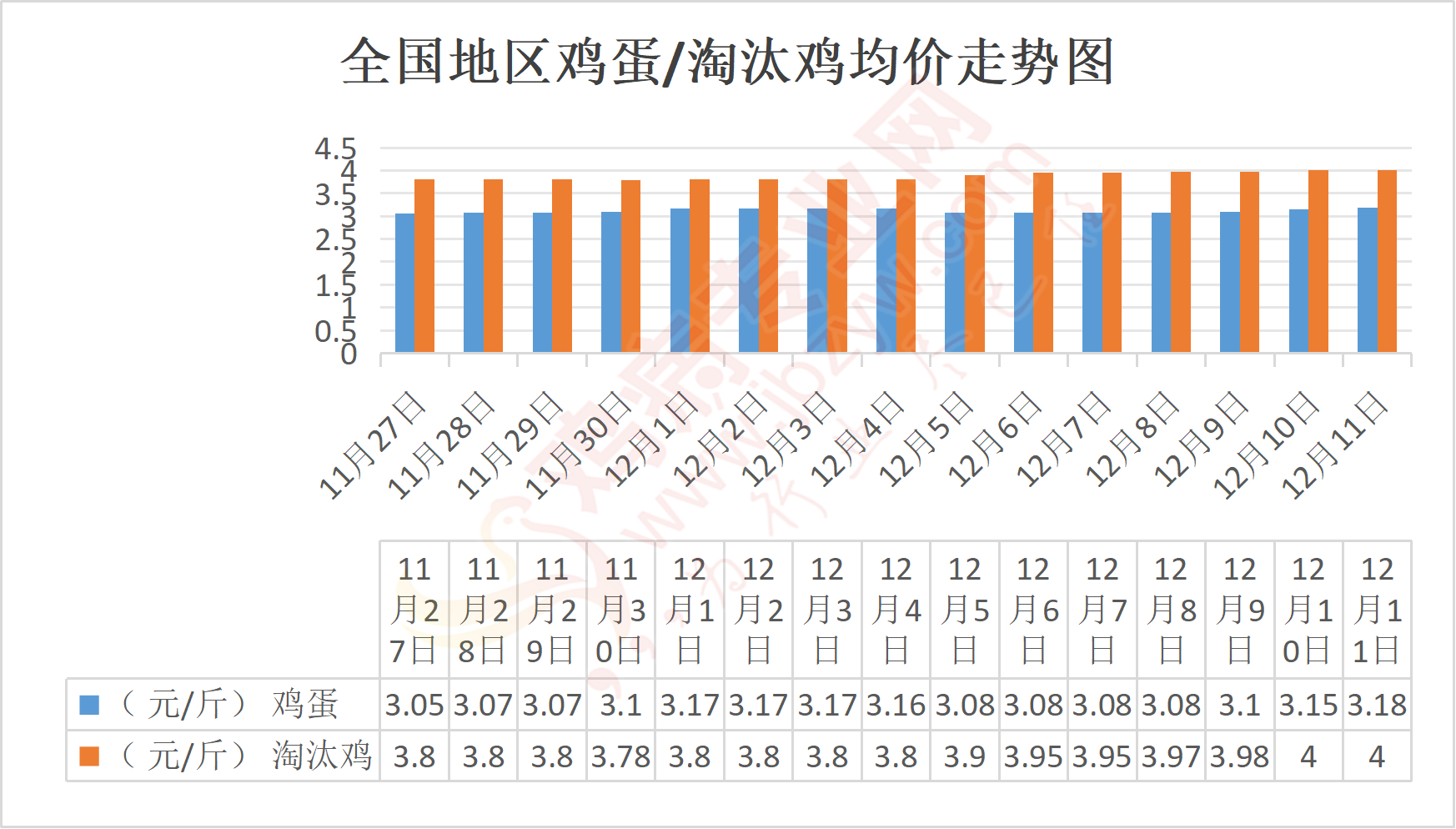 河南地区:邓州鸡蛋3-3.05元/斤,与昨日相比涨,淘汰鸡3.9-4.4元/斤;