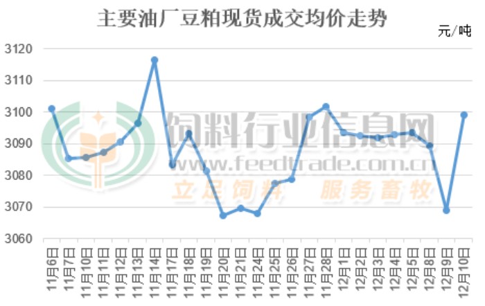 据监测数据显示,昨日主要油厂 43%蛋白豆粕成交均价在 3100元/吨,较上一个工作日上涨30 元/吨。而今日更是因中国大豆买家继续购买美国大豆,支撑美盘大豆价格从低点反弹并带动进口大豆成本出现上涨,增强了对豆粕的提价意愿。相关报价显示,今日43%蛋白豆粕报价普遍上涨 40-50 元/吨。随着相关消息持续发酵,加之气温下降后畜禽需求逐渐增加,或引发饲料养殖企业备货积极性,从而继续支撑豆粕市场维持震荡偏强行情。