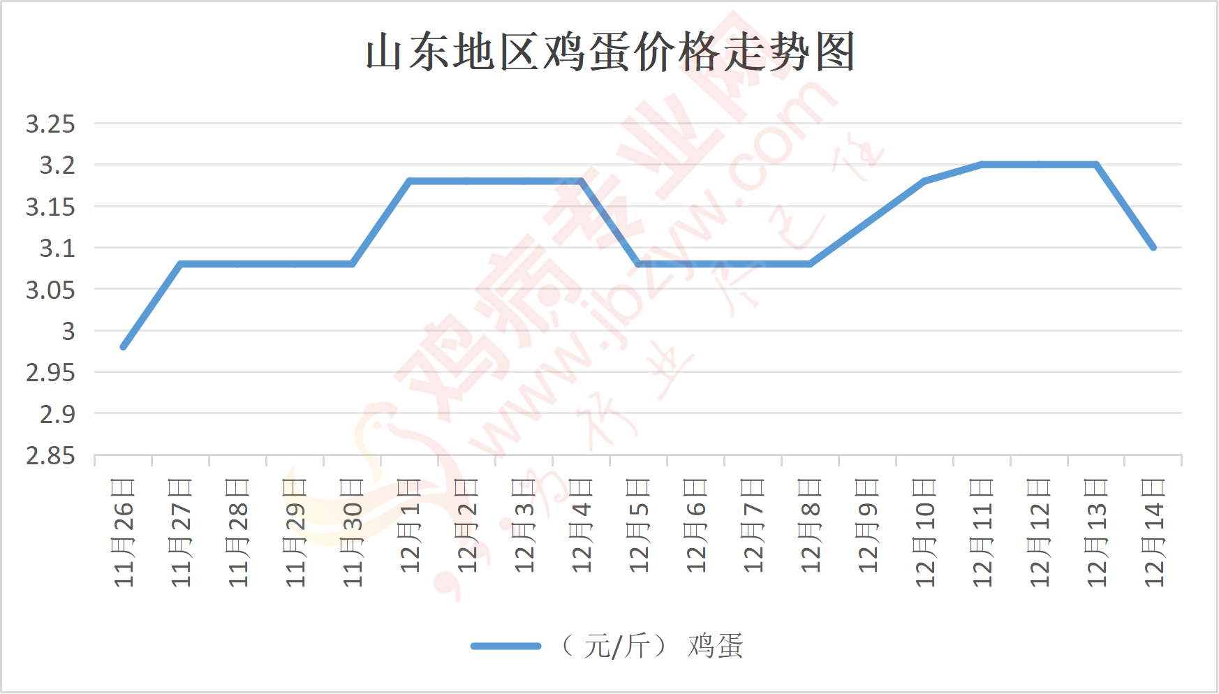 鸡病专业网消息:12月14日,山东地区莱阳鸡蛋3.15元/斤,落;青岛鸡蛋3.15元/斤,落;诸城鸡蛋3.15元/斤,落;安丘鸡蛋3.05元/斤,落;昌乐鸡蛋3.05元/斤,落;寿光鸡蛋3.05元/斤,落;昌邑鸡蛋3.05元/斤,落;高密鸡蛋3.15元/斤,落;青州鸡蛋3.05元/斤,落;临朐鸡蛋3.05元/斤,落;莱州鸡蛋3.15元/斤,落;威海鸡蛋3.15元/斤,落;临沭鸡蛋3.1元/斤,落;沂水鸡蛋3.1元/斤,落;沂南鸡蛋3.1元/斤,落;莒南鸡蛋3.1元/斤,落;兰陵县鸡蛋3.1元/斤,落;日照鸡蛋3.1元/斤,落;莒县鸡蛋3.1元/斤,落;日照辛萁商贸鸡蛋3.1元/斤,落;泗水鸡蛋价格90元/斤,落;济宁、汶上鸡蛋价格90元/斤,落;梁山、东平红蛋价格90元/斤,落;枣庄滕州地区鸡蛋混码主流到户91元/30斤,落;泰安地区新泰鸡蛋价格90元/斤,落;菏泽地区曹县主流到户90元/斤,落;成武鸡蛋价格90元/斤,落;单县到户90元/斤,落;聊城莘县90元/斤,落。