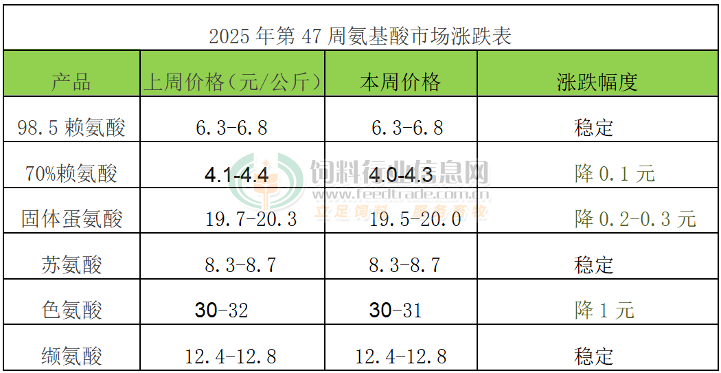 色氨酸市场动态,依据不同品牌不同货量,市场报价30-31元/公斤,2025年1-10月国内进口色氨酸23905吨,同比增加23.5%.11月17日象屿生化色氨酸报价35元/公斤,畜禽养殖处于亏损区,下游采购意愿不足,市场购销平淡,回调整理。