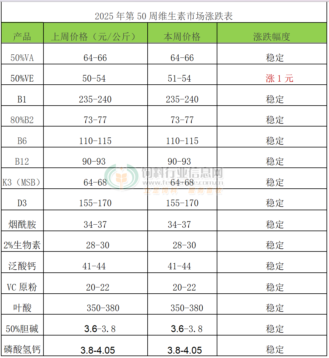VE:本周VE市场报价51-54元/公斤。欧洲VE市场报价5.5-6欧元/公斤。欧洲VE市场报价5.5-6欧元/公斤。北沙制药计划7月开始停产检修10-11周。8月7日BASF宣称VE产品解除不可抗力状态。10月30日市场称浙江医药VE产品报价提至60元/公斤。11月3日市场称益曼特计划自11月初检修至12月底。12月1日市场称新和成VE产品提价至65元/公斤,市场成交上行。