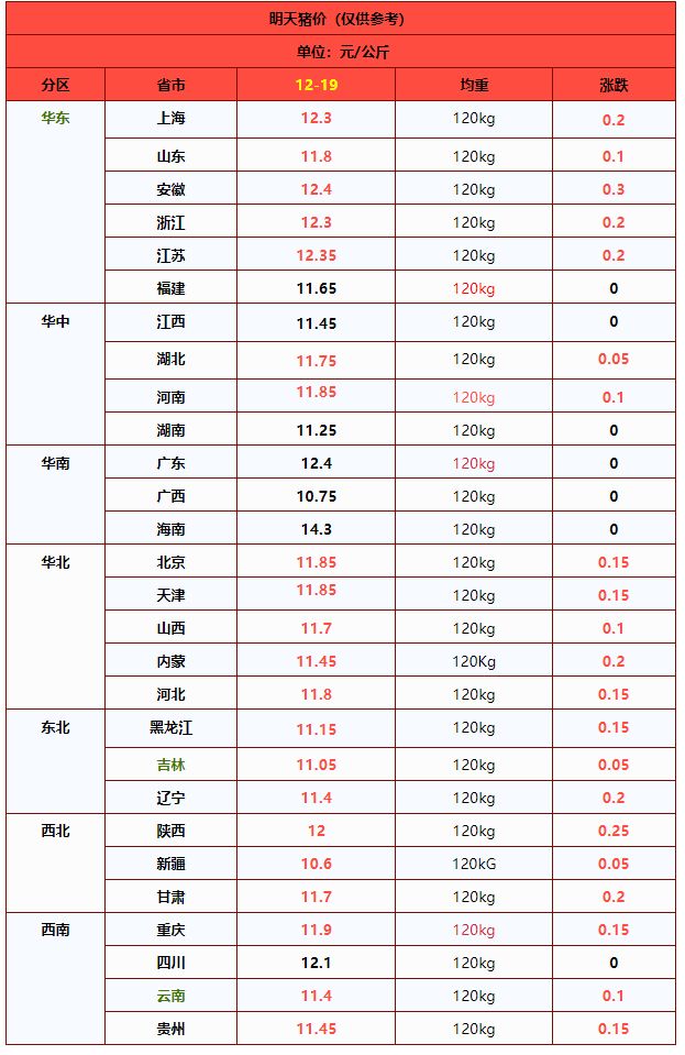 | 黑龙江 | 10.96 | 10.83 | 1.20% | 元/KG | |