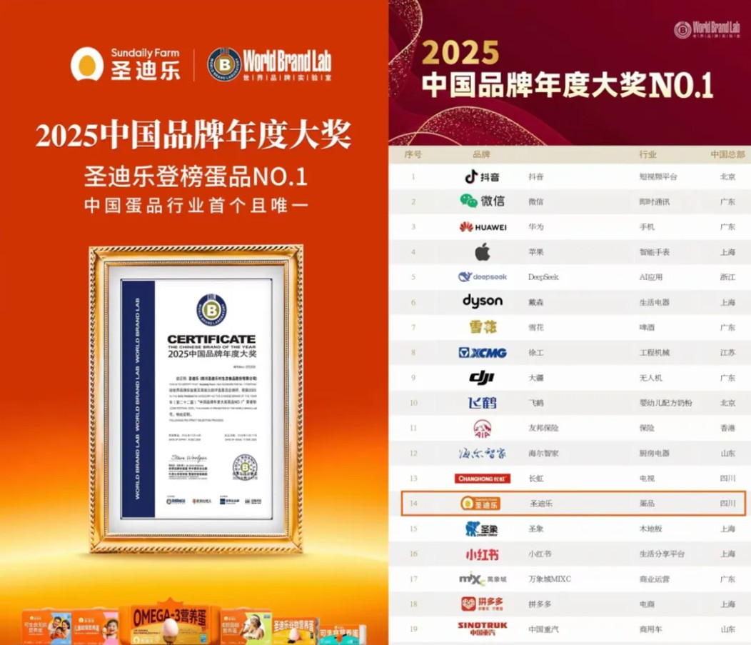 12月17日,世界品牌实验室(worldlab)权威发布2025中国品牌年度大奖榜单,圣迪乐凭借强劲实力斩获蛋品领域NO.1,成为中国首个、行业唯一获此殊荣的品牌。此次,圣迪乐与华为、大疆、飞鹤等中国领军品牌同登荣耀殿堂,彰显中国鸡蛋品牌的强劲竞争力与品牌影响力。
