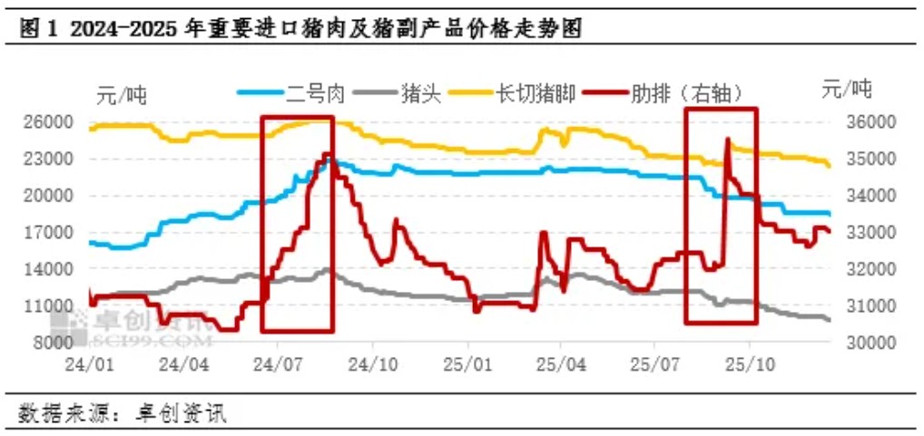 2025年12月16日商务部已确认了欧盟猪肉反倾销事实,但据反倾销税的追溯征收条例规定,前期进口商提供保证金,按终裁所确定的征收反倾销税的产品范围和反倾销税税率计征并转为反倾销税,并按相应的增值税税率计征进口环节增值税。依据保证金比率及税率对比,多数进口商会进行依法退税,因金额不大,对进口产品市场的影响有限,当下进口产品价格依旧维持缓跌的局面。据卓创资讯统计,截至2025年12月17日,进口二号肉成交均价为18500元/吨,进口猪头均价为9817元/吨,长切猪脚均价为22350元/吨,进口肋排均价为33033元/吨。