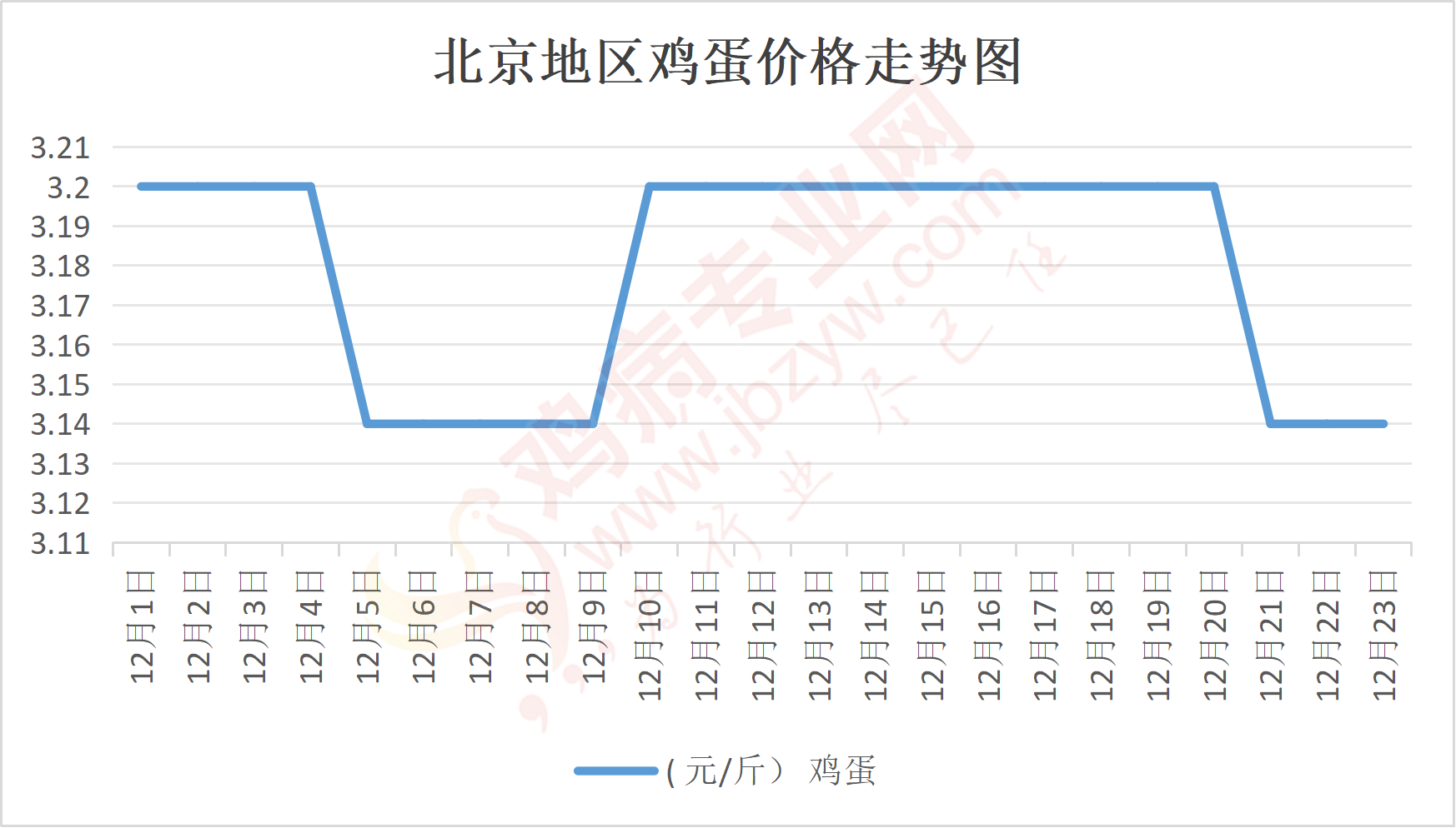 鸡病专业网消息:12月23日,北京大洋路鸡蛋主流批发价格138-139元/44斤,稳,到货5台车,成交灵活,走货正常;回龙观鸡蛋138元/44斤,稳;顺义石门鸡蛋138元/44斤,稳。
