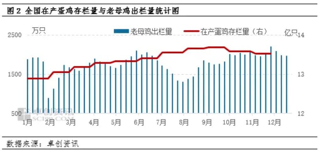 鸡蛋价格或小幅上涨。根据影响产蛋鸡存栏量的重要指标补栏量、出栏量、上月存栏基数等,可推断12月、1月在产蛋鸡存栏量分别为13.45亿只、13.34亿只,环比减幅分别为0.52%、0.82%,存栏高位回落,鸡蛋供应压力继续下降。需求方面,12月下旬受到圣诞、元旦等节日提振,商超促销备货将拉动鸡蛋需求,1月份春节备货需求启动,下游贸易商及食品厂采购量均将提升,市场需求将出现实质性的好转,在供应压力稍降、需求好转支撑下,蛋价仍有上涨预期,但存栏量依然处于较高水平,蛋价上涨幅度有限,预计1月份的主产区蛋价最高或涨至3.40元/斤左右。