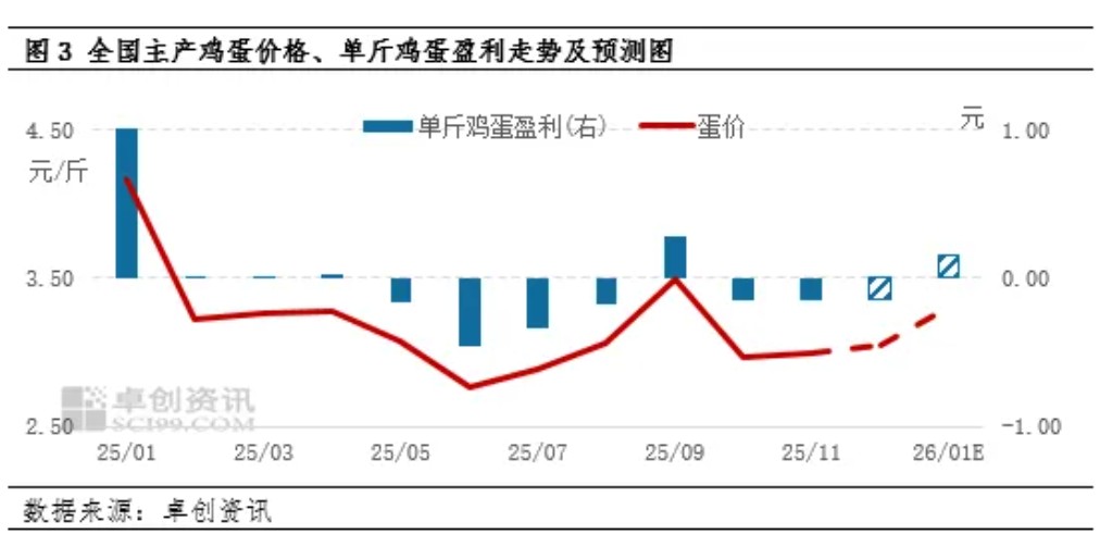 12月蛋价低位小幅上涨,鸡蛋利润虽仍处亏损,但亏损值逐步收窄。当前鸡蛋供需处于博弈状态,供应压力略有缓解但存栏仍高,需求整体疲软却有阶段性好转。展望1月,鸡蛋供应压力持续下降,节日备货将拉动需求回升,蛋价存上涨空间,饲料成本或小幅下降,鸡蛋利润有望扭亏为盈,进入微利区间。