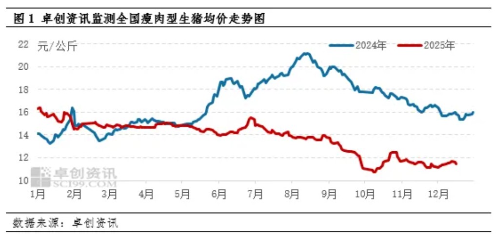 截至12月22日,卓创资讯监测2025年全国瘦肉型生猪均价平均为13.80元/公斤,同比降低17.66%,年内呈降后横盘稳定再震荡下滑态势。其中,最高价为1月4日的16.36元/公斤,最低价为10月13日的10.72元/公斤。2025年产能释放,生猪出栏量增加,需求增幅有限,导致猪价同比下跌。其中,一、二季度肥标价差高位,养殖端压栏挺价,猪价降后横盘稳定。二季度末之后,肥标价差缩小、养殖端产能释放,同时政策层面降体重、禁二育、减产能等要求,养殖端出栏节奏加快,猪价震荡下滑。