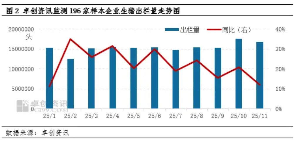 按照生猪繁育周期推算,2025年1-11月的生猪出栏量是由2024年3月到2025年1月份的能繁母猪存栏量决定的,卓创资讯监测此阶段内196家样本企业能繁母猪平均为852.64万头,较上一周期(2023年3月-2024年1月)增加5.61%,在生产效能同步提升的情况下,2025年1-11月份出栏量同比增加。卓创资讯监测1-11月196家样本企业生猪出栏总量为16896.5万头,同比增幅21.58%,利空生猪价格。