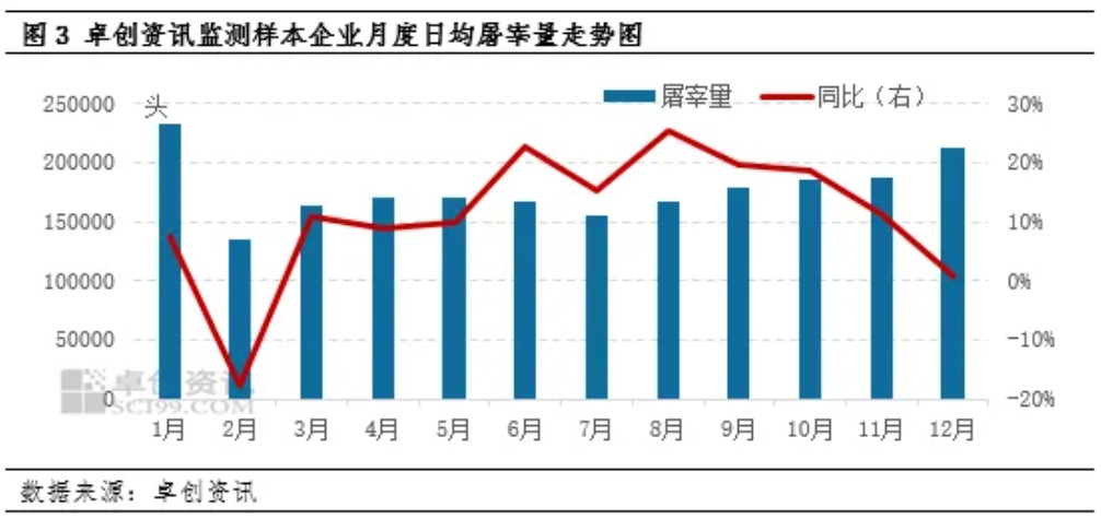 截至12月22日,卓创资讯监测2025年样本企业日均屠宰量为17.57万头,同比增加9.27%。从长周期看屠宰量可作为供应指标,2025年生猪出栏量增加自然带动生猪屠宰量增加;而从短周期实际需求看,2025年需求恢复,同时低价猪产低价肉,低价肉刺激需求弹性提升,月度日均屠宰量同比增幅平均在11.02%。屠宰量虽同比增加,但与出栏量增幅相比却不足,对猪价支撑力度相对有限。