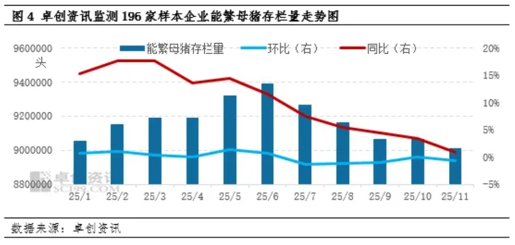 按繁育周期推算,2026年生猪出栏量是由2025年3月到2026年2月份的能繁母猪存栏量决定的。卓创资讯监测2025年3-11月196家样本企业能繁母猪存栏量先增加后减少,平均为918.31万头,较上一周期(2024年3月-2024年11月)增加8.54%,对应2026年生猪供应仍较充裕。在去产能政策的要求下,2025年12月至2026年2月能繁母猪存栏量预计继续缓慢减少,但前期产能高位以及生产效能提升仍为2026年带来供应压力。整体来看,供应端对2026年猪价产生利空影响,趋势上或先利空后利多。