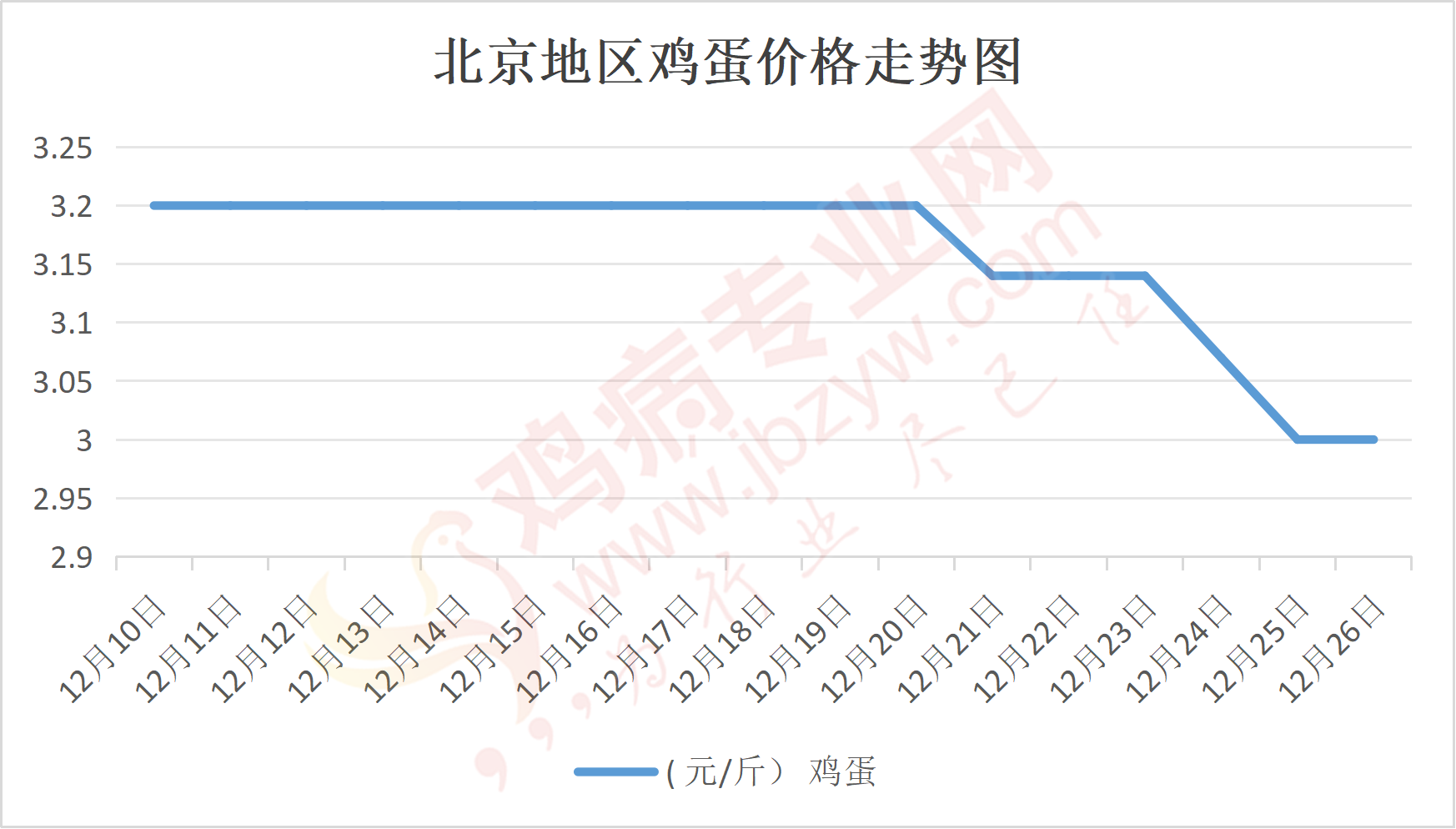 鸡病专业网消息:12月26日,北京大洋路鸡蛋主流批发价格132-133元/44斤,稳,到货3台车,成交灵活,走货正常;回龙观鸡蛋132元/44斤,稳;顺义石门鸡蛋132元/44斤,稳。