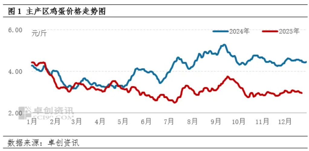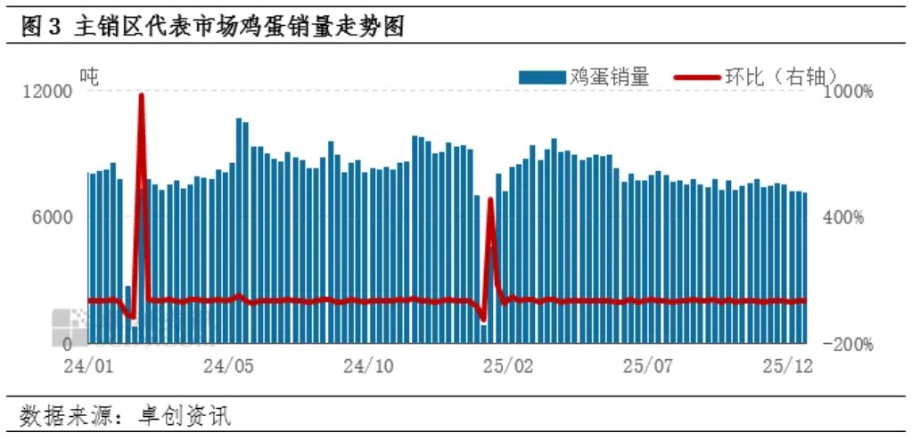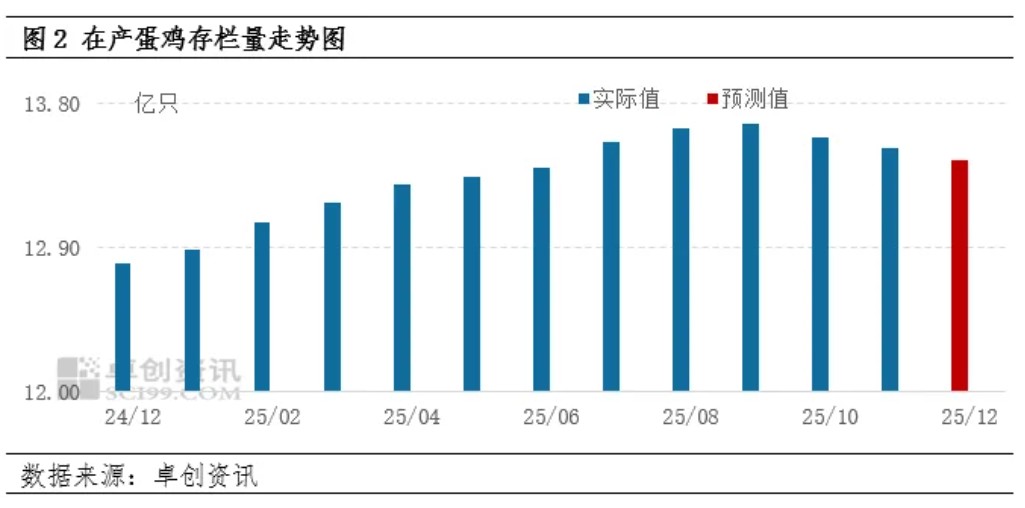 存栏有下降预期,供应压力或减少。从养殖周期推算,2026年1-2月份是2025年9-10月份补栏的鸡苗,受养殖盈利不及预期影响,2025年9-10月份养殖企业补栏积极性不高,鸡苗销量呈减少趋势,因此2026年1-2月份新开产蛋鸡数量不多。从老母鸡来看,养殖企业大多计划春节前出栏老母鸡,因此1-2月份老母鸡出栏量有增加趋势。综合来看,1-2月份老母鸡出栏量或多于新开产蛋鸡数量,在产蛋鸡存栏量有下降预期,鸡蛋供应压力或减少。