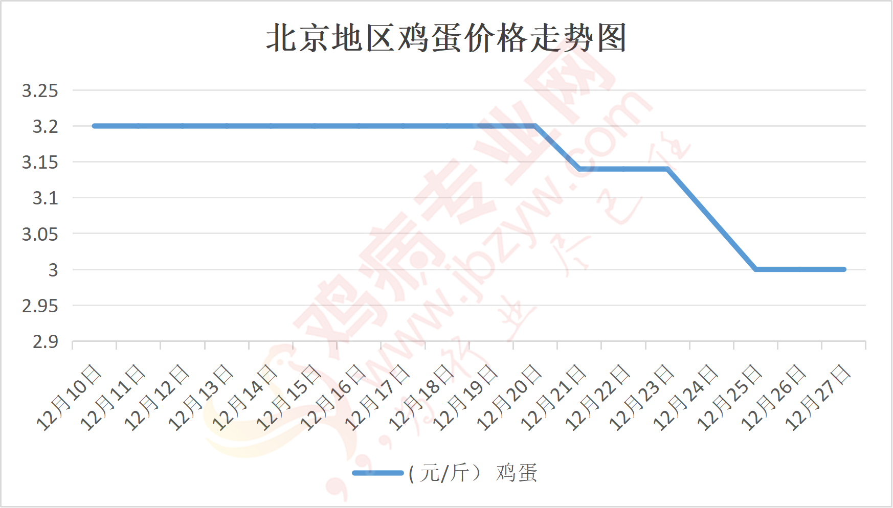 鸡病专业网消息:12月27日,北京大洋路鸡蛋主流批发价格132-133元/44斤,稳,到货5台车,成交灵活,走货正常偏快;回龙观鸡蛋132元/44斤,稳;顺义石门鸡蛋132元/44斤,稳。